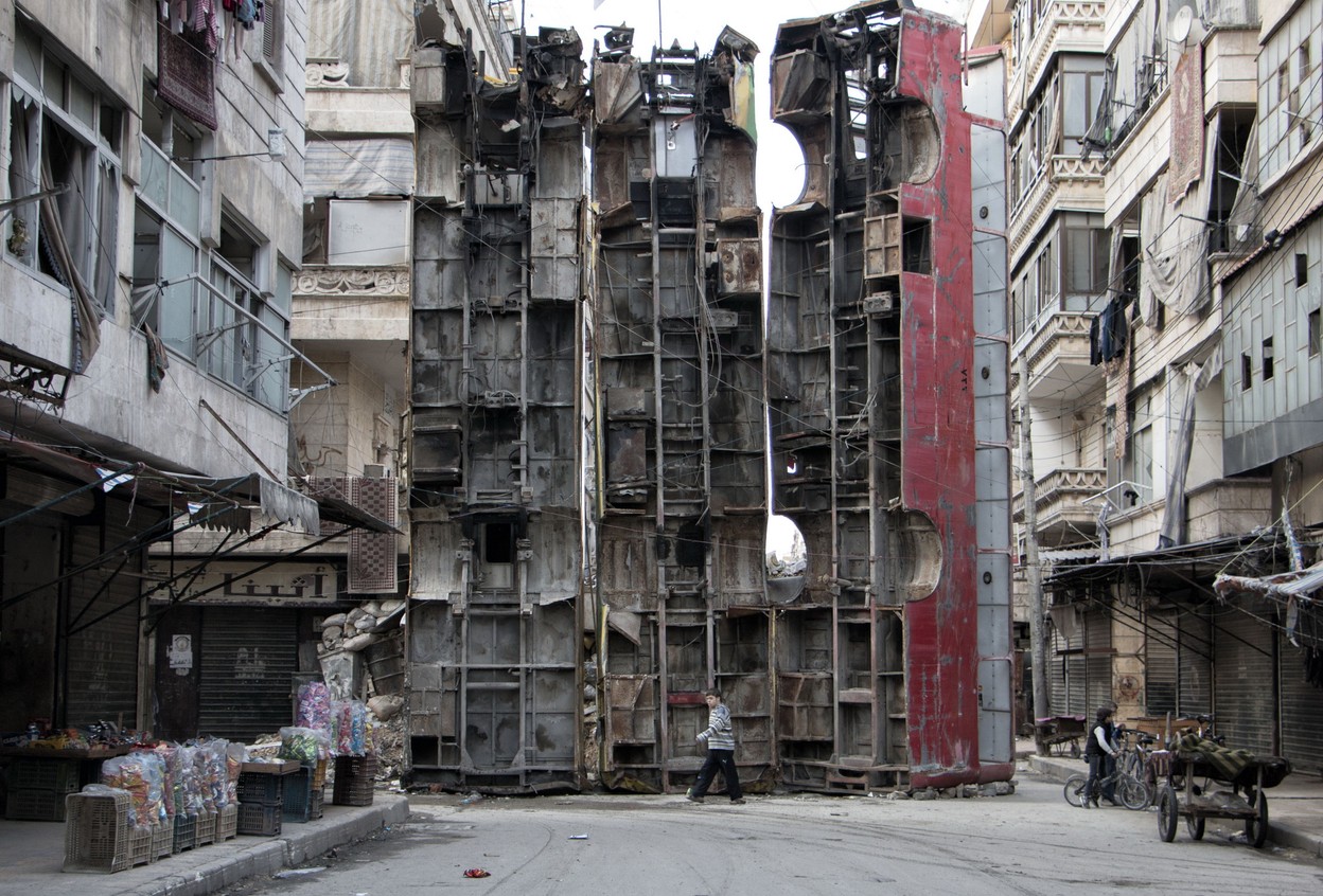 Baricadă din autobuze ce apără localnicii din orașul Alep (Siria) de gloanțele lunetiștilor. Războiul sirian care a început în 2012 cu un conflict, s-a transformat pe parcurs într-o luptă interconfesională. Părțile combatante sunt forțele guvernamentale și formațiunilor înarmate, pe de o parte și grupele de rebeli înarmați (în mare parte islamiști) — pe de altă parte. Cel mai mult a avut de suferit orașul Alep, în care s-au dus lupte îndelungate, fiind un punct strategic pentru ambele părți combatante. Localnicii sunt nevoiți să se adapteze luptelor continue și să se apere cum pot.